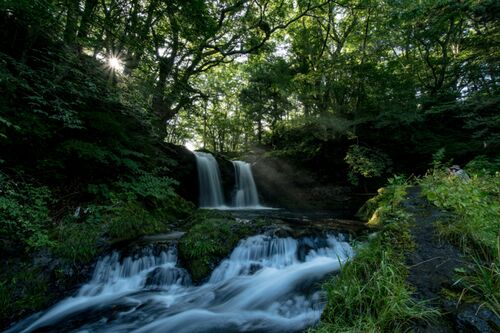 蒸し暑い伊豆を抜け出して、富士吉田周辺に涼みに行きました。 鐘山滝 明見湖の途中、鐘山滝の前を通ることが分かり、急遽寄ってみたら、光芒が出まくり。7:47光芒をきれいに止めるには、高速シャッターの方が良いのか?(富士山ミュージアムの駐車場は9:30…