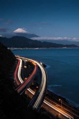 墓参りの帰りに、遠回りしてさった峠に登る。 雨は午後には止んで、富士山には雲がまとわりつくが、待てば顔を出す薄暮まで待って、ようやく車の明かりが点る 左端の灯りは東海道線(30秒かかる) 年末のせいか、交通量は多い
