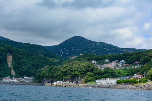 定置網に使われる船は、川奈近くから、陸から少し離れて、一気に赤沢まで下る。赤沢から陸に近い所をゆっくりと北上する。 赤沢港の背後に伊雄山。左の崖には土砂崩れの跡がむき出しになる南を向くと、赤窪火山からの溶岩流の中ノ崎が見える 松の下にある持…