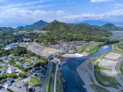 近場で、午後の順光で空撮できるジオサイトを選んで出かけた。 狩野川放水路 狩野川放水路の墹之上の取水堰。富士山は雲に隠れて、狩野川にも雲の影がかかる。 戸田・御浜岬 海上から御浜岬を狙うが、高度150mではこれが限界。 mini2の180度パノラマ。歪が大…