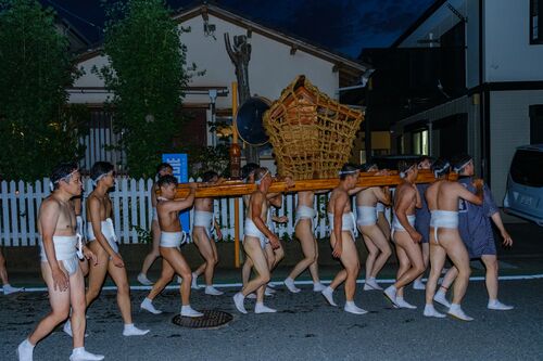 八坂神社(新明神社の摂社)のお天王さんの裸神輿の音が聞こえてきたので、あわててカメラを持って追いかけた。回覧板を見ていなかったので、いつやるか知らなかった。(大場川のみそぎは実施したのか?) 町内を巡幸する裸神輿。通り道の家には提灯の灯りが…