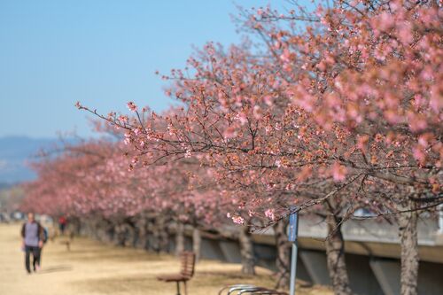 大仁の狩野川堤防の城山さくら(河津さくら)が二三分咲きとの新聞記事を見て、ロケハンしてきた。来週あたりは見ごろで人手も増えるだろう。 ほとんどの木は二三分咲きだった。数本が五分咲き。単焦点の望遠レンズで狙った。