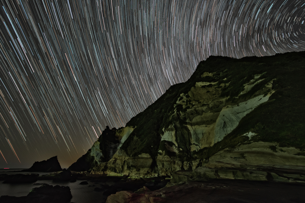 真っ暗な林道と磯道を一時間かけてたどり着いた千畳敷は、過去最高に良く見える満天の星空。天の川は、西に傾いている。沖に浮かぶ漁船のライトで三ツ石岬が色づくのが唯一の欠点だった。