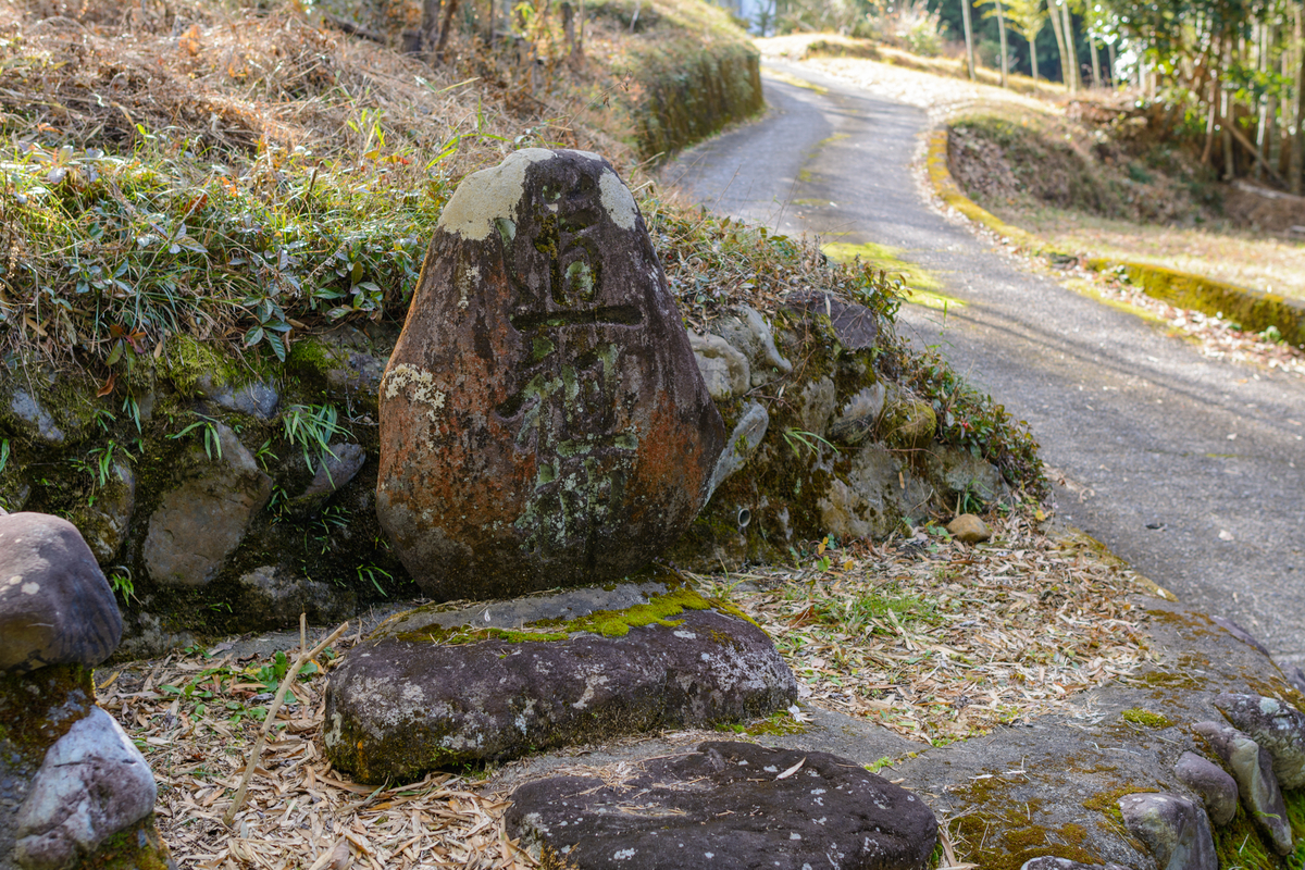 安居山 御見給の旧道沿いの竹林を背に、二基の石造物が祀られている。左像-道標を兼ねた文字碑