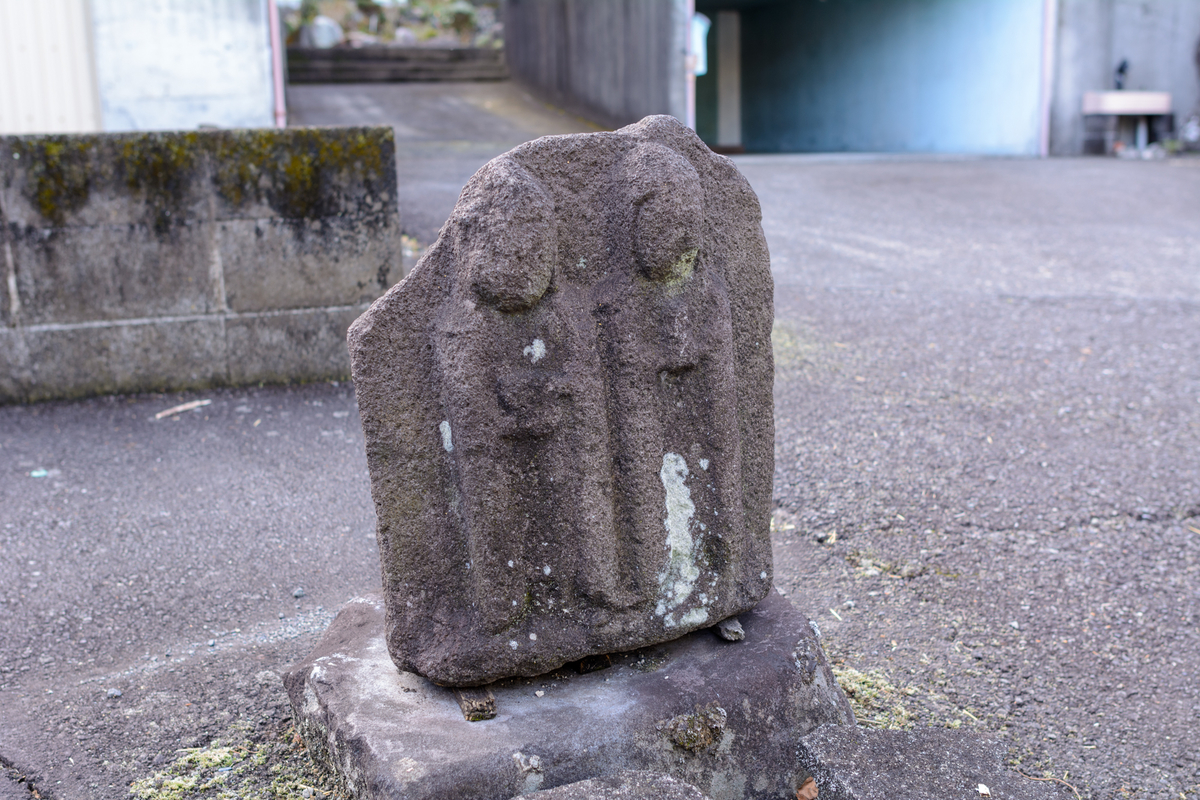 認定こども園入口の坂右手に、祭壇を設けて、二基の石造物が祀られている。左像は、双体