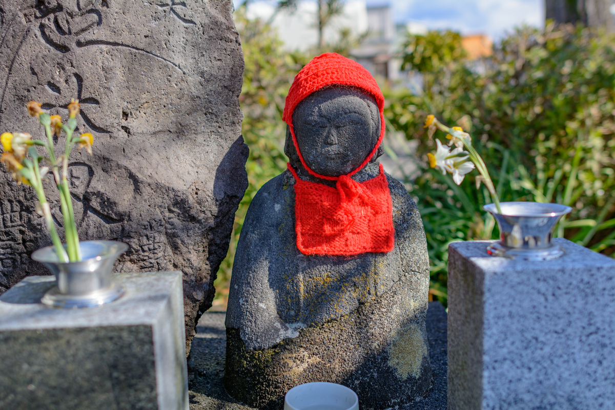 今宮の民家入口左手に祭場を設けて、今泉-7-単体(浮彫・立像・合掌・白カビ・苔)が祀られている。右側に玉石が賽物として供えられている。