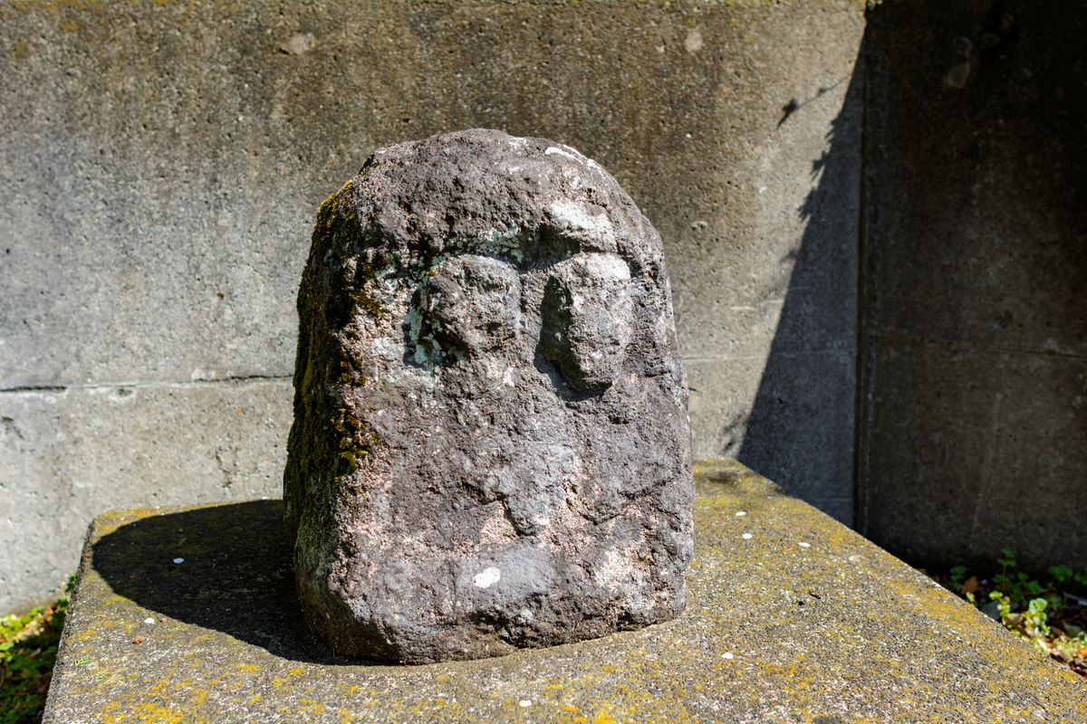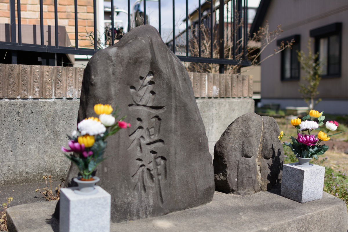 天間南区の自主防災倉庫右手にコンクリの祭場を設けて、二基の石造物が祀られている。右像-鷹岡-18-文字碑[道祖神]