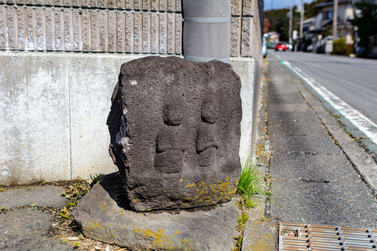 天間北区公会堂前(瘡守神社近く)のY字路・北角に、鷹岡-38-双体(摩滅・両神-合掌)が祀られている。