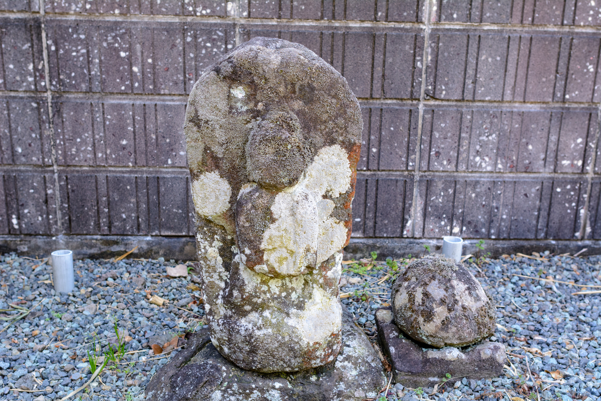 大渕の三叉路・西側にブロックで祭壇を設けて、二基の石造物が祀られている。左像-大渕-33-双体(摩滅・両神-合掌)と考える。