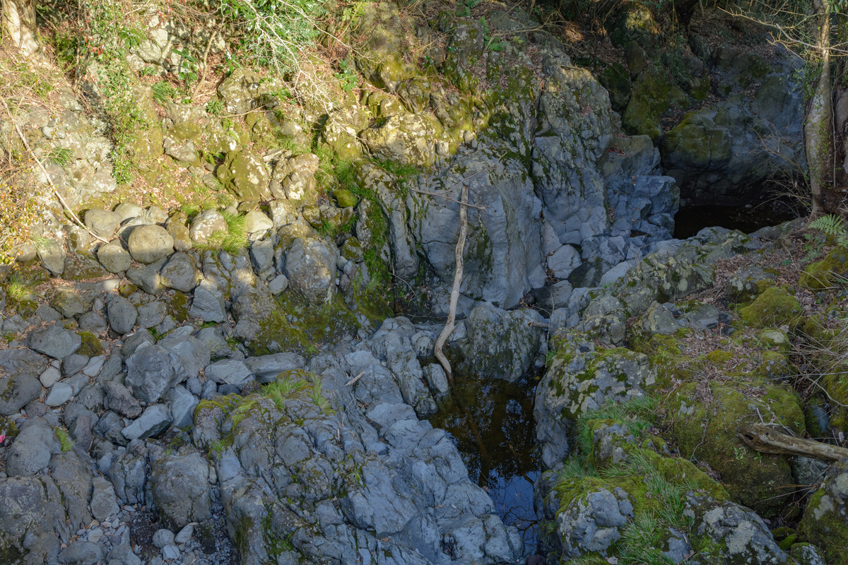桑崎橋の下を見ると、大渕溶岩流が露頭している。