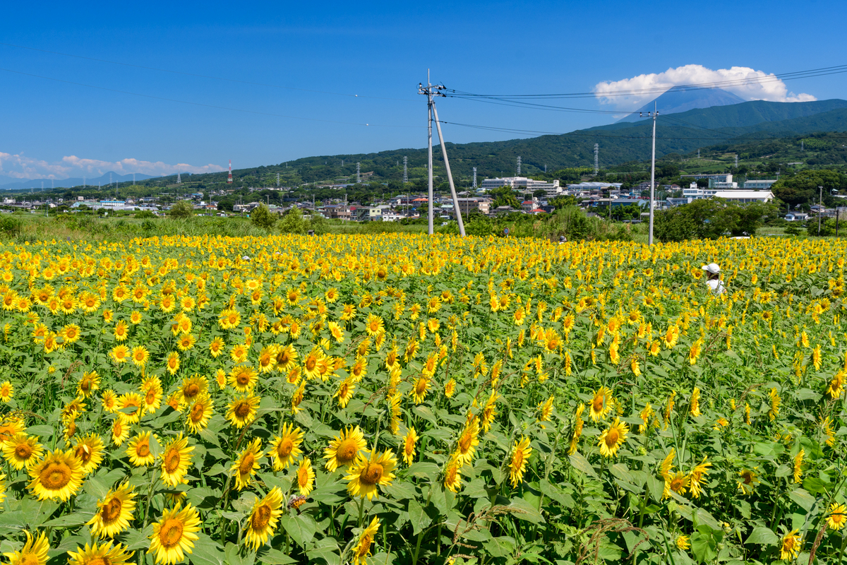 2023-07-24 浮島のひまわりランド 写真 富士市・浮島のひまわりランドのヒマワリが見ごろとのニュースに、猛暑にも関わらず出かけてしまった。 南側のヒマワリ畑は一斉に見ごろとなっている。電線と富士山の山頂に雲があるのが残念。 西南角に電線がかぶらない場所もあるが、花の数が少ない。L背景が課題。