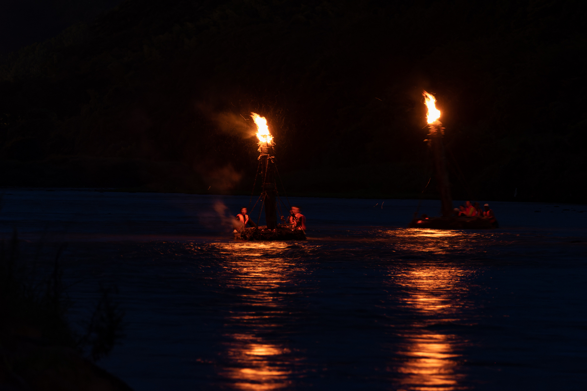中と大松明が並んで流れる。大松明は火の着きが良くないようだ。