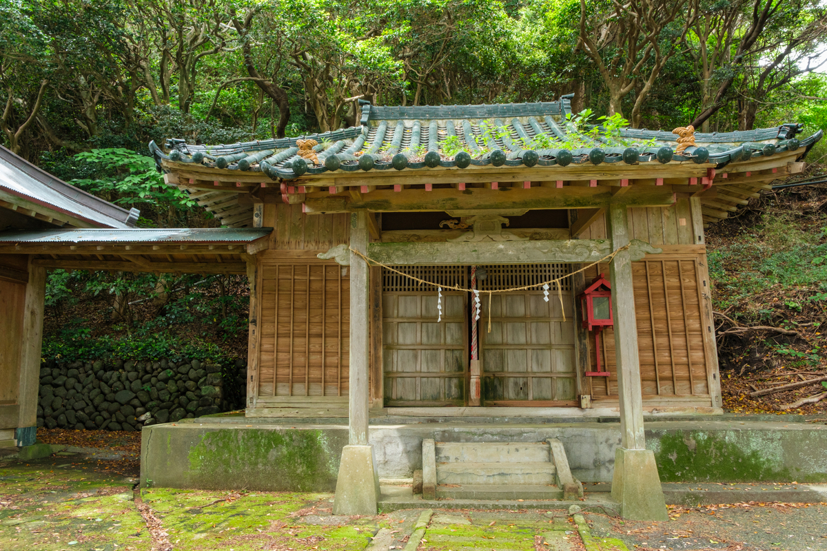 三島神社]と記されている。鞘堂は、南西240度の海を向いている。斜面に直交させているのだろう。