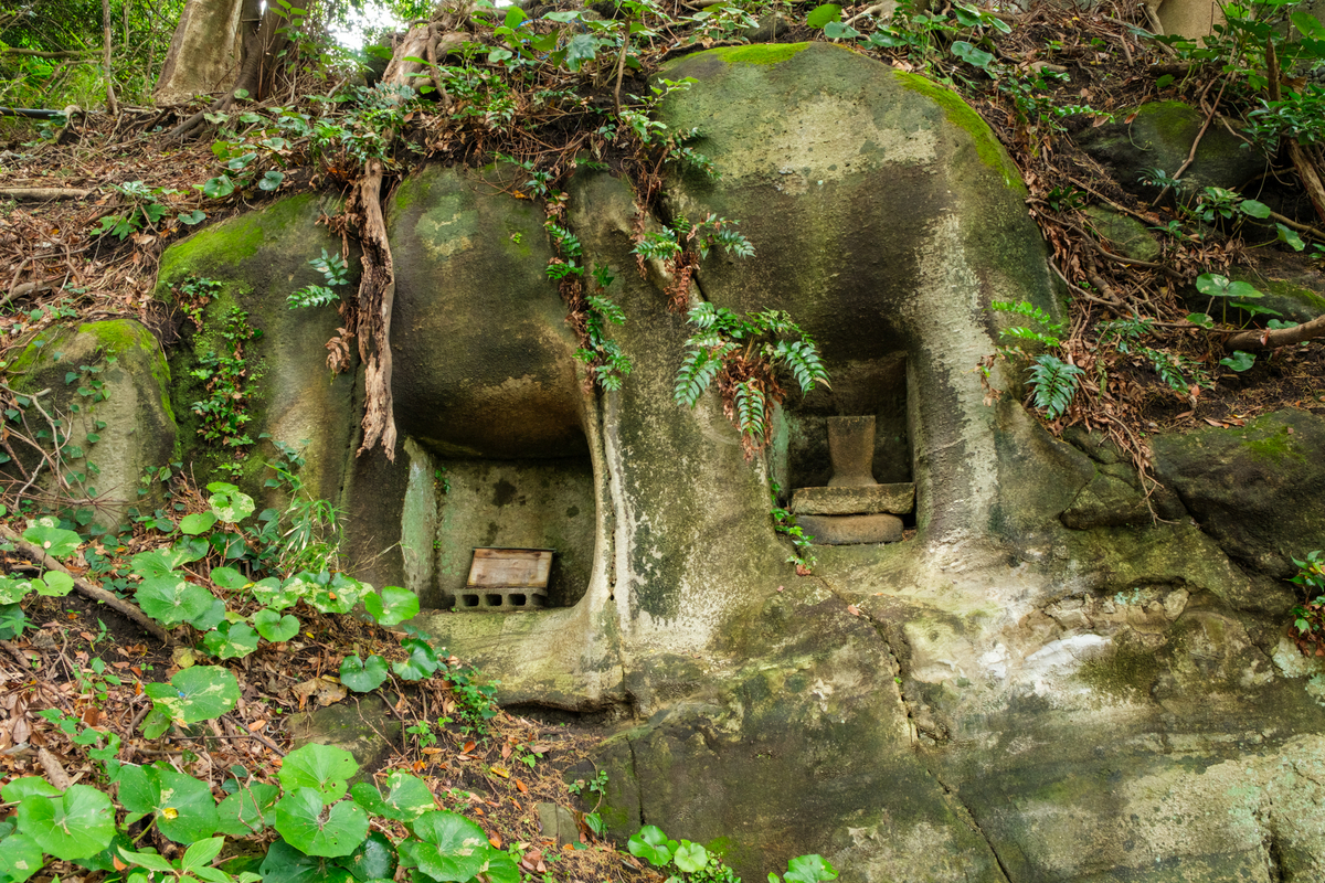 境内の露頭を削って、何かを祀った跡が残る。
