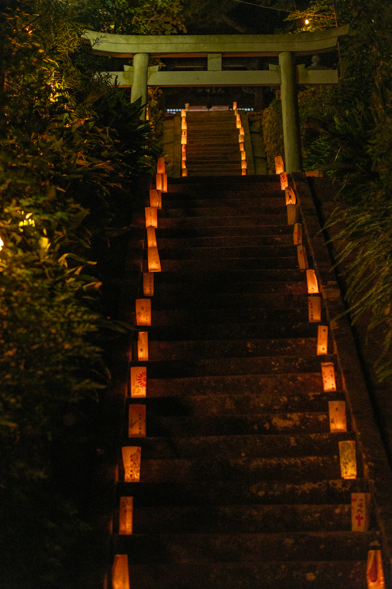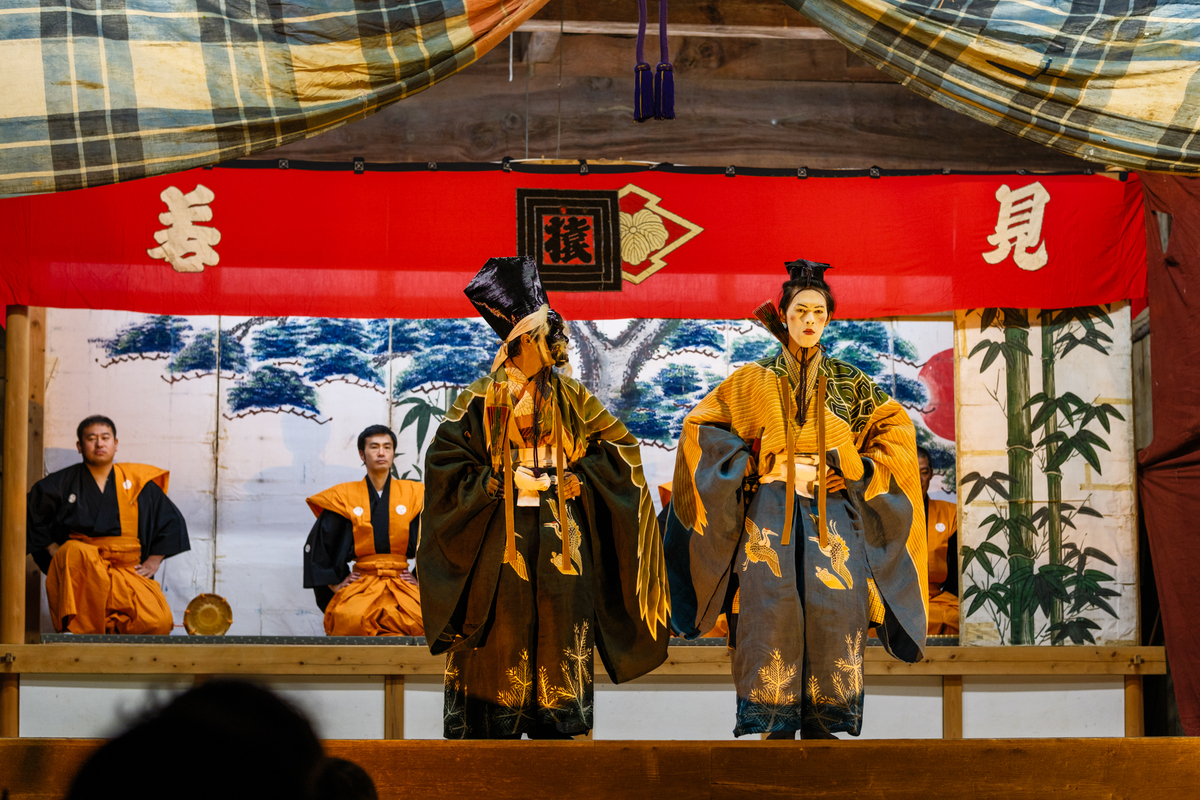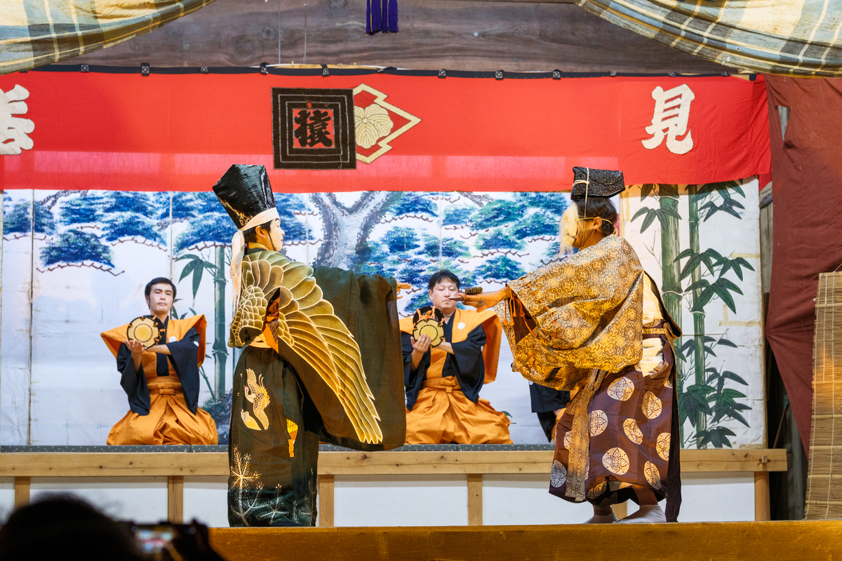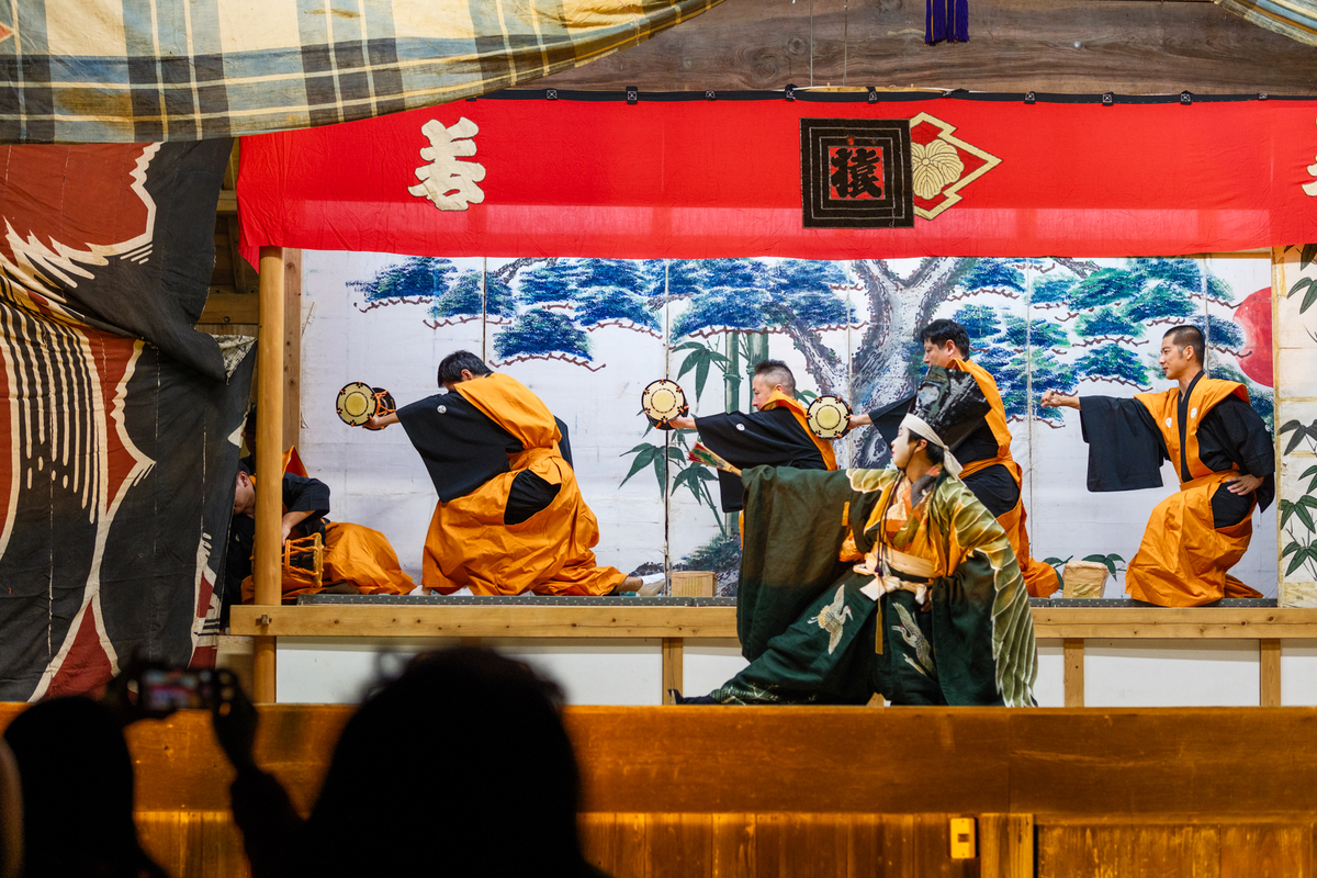 境内の神楽殿には、地元出身の歌舞伎役者・市川小団次などから寄贈された引幕が掛けられている。篝火の灯りがほど良い照明となっている。