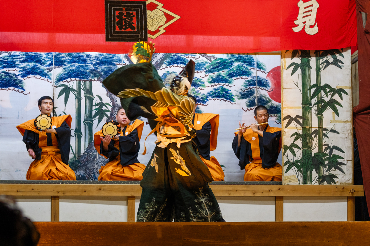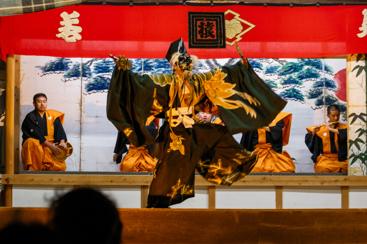 境内に立つ神楽殿で三番叟が奉納される。正式には、23日の昼間の祭典だが、前日の宵に試しに三番叟が奉納される。