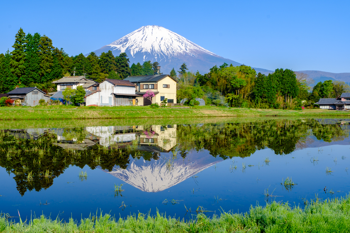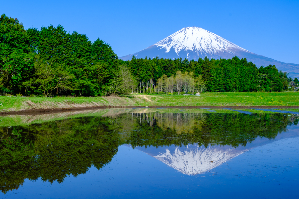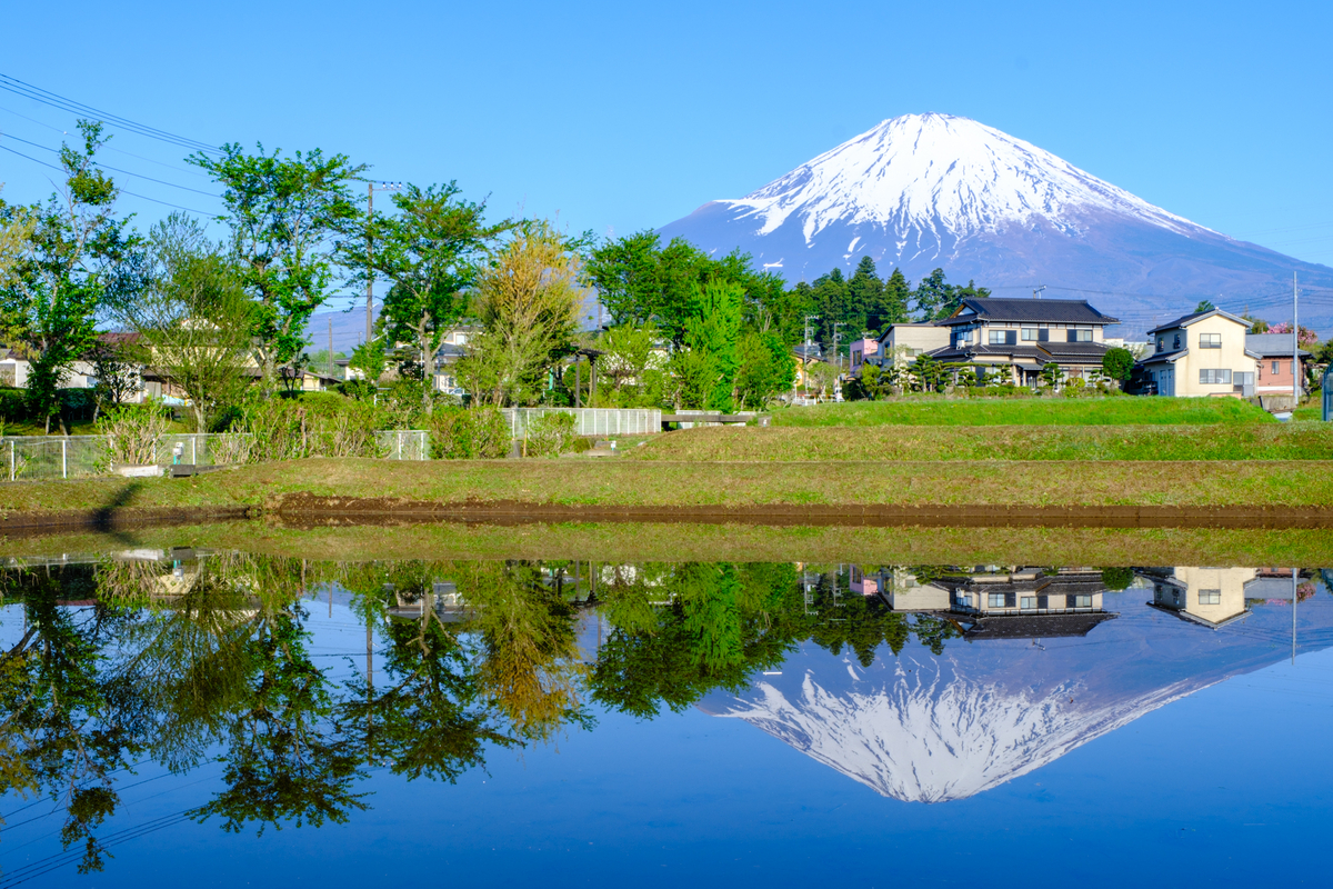 連休晴れの早朝、田んぼに映り込む逆さ富士に期待して、御殿場にでかけた。