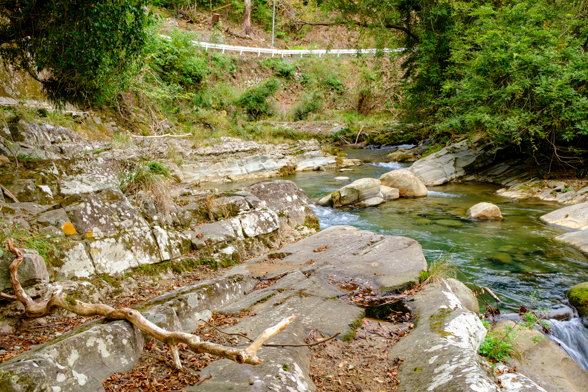 白川の集落につながる林道の山側の崖に、露頭が続く。