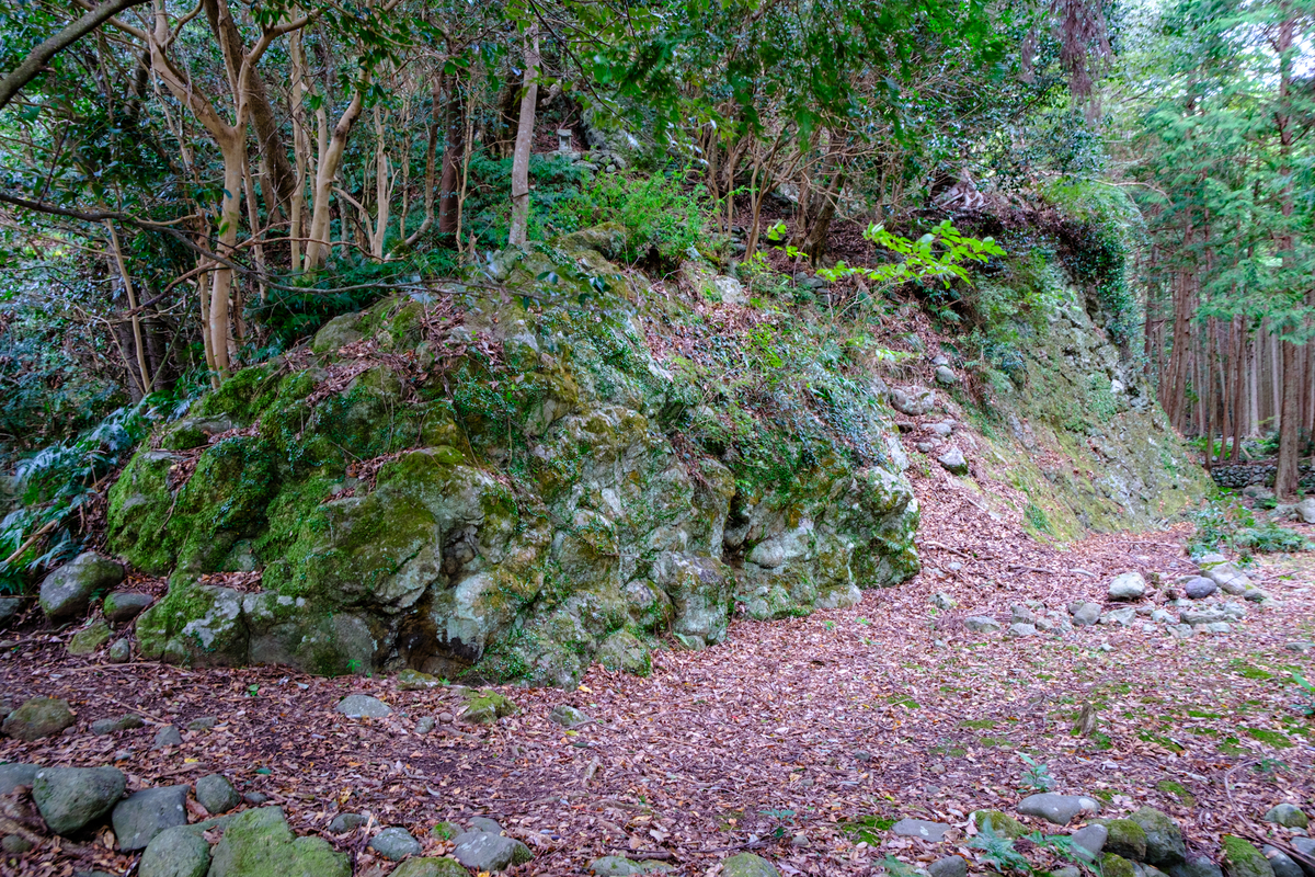 枕状溶岩の露頭の上に、石祠を囲んで、二つの水底土石流の高まりがあった。